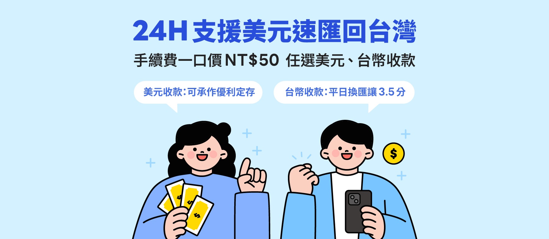 LINE Bank接受來自台灣或世界各地的美元匯入款,單筆金額無上限!凡安全合法取得之資金、存款、薪資收入、投資收益、虛擬貨幣出金…等適用,全年無休,任選外幣、台幣收款,還能享受美元優利定存、平日限時換匯讓分。