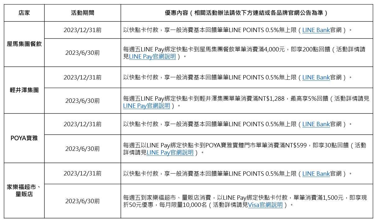 想要好好大吃一頓,慰勞自己的身心嗎?2023/6/30前,每週五到屋馬集團餐飲大啖美食,以LINE Pay綁定快點卡付款,即可享「天天LINE Pay日」活動優惠,單筆消費滿NT$4,000,即享200點回饋,等於拿到95折回饋。