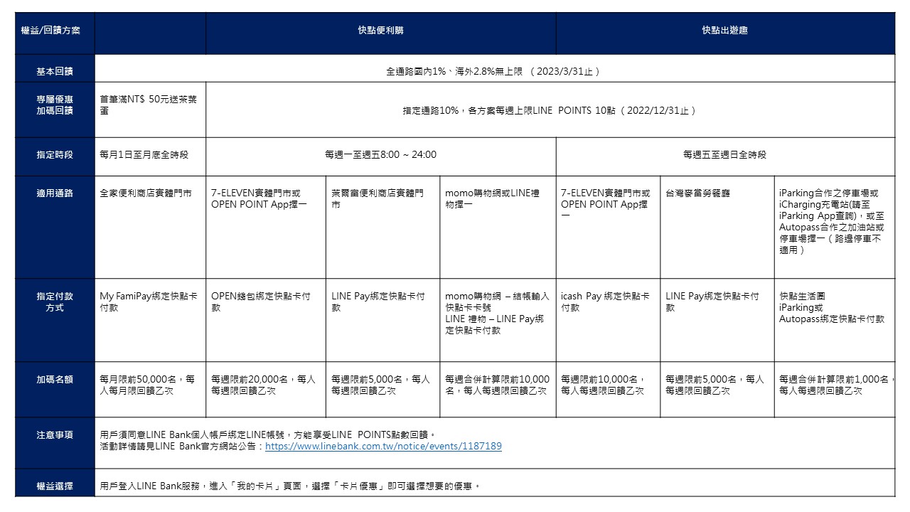 LINE Bank快點卡「快點便利購」、「快點出遊趣」優惠持續至12月底,無論是三大超商、兩大購物網、美食餐廳與悠遊出行領域,皆享最高LINE POINTS 11%點數回饋。