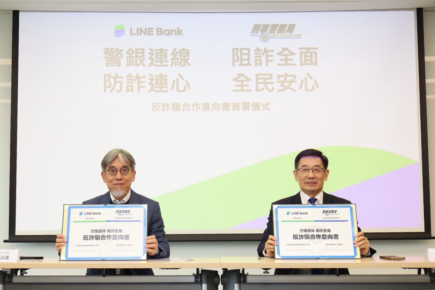 LINE Bank(連線商業銀行)近年推動AI科技阻詐有成,近2年警示帳戶數下降15.05%成效亮眼,昨(9)日進一步與內政部警政署刑事警察局簽署「反詐騙合作意向書(MOU)」,以「情資即時連線、詐騙前端阻斷」為核心精神,整合LINE Bank拿手的「科技化打詐」與刑事警察局詐騙查緝經驗,全面升級線上金融防護網。