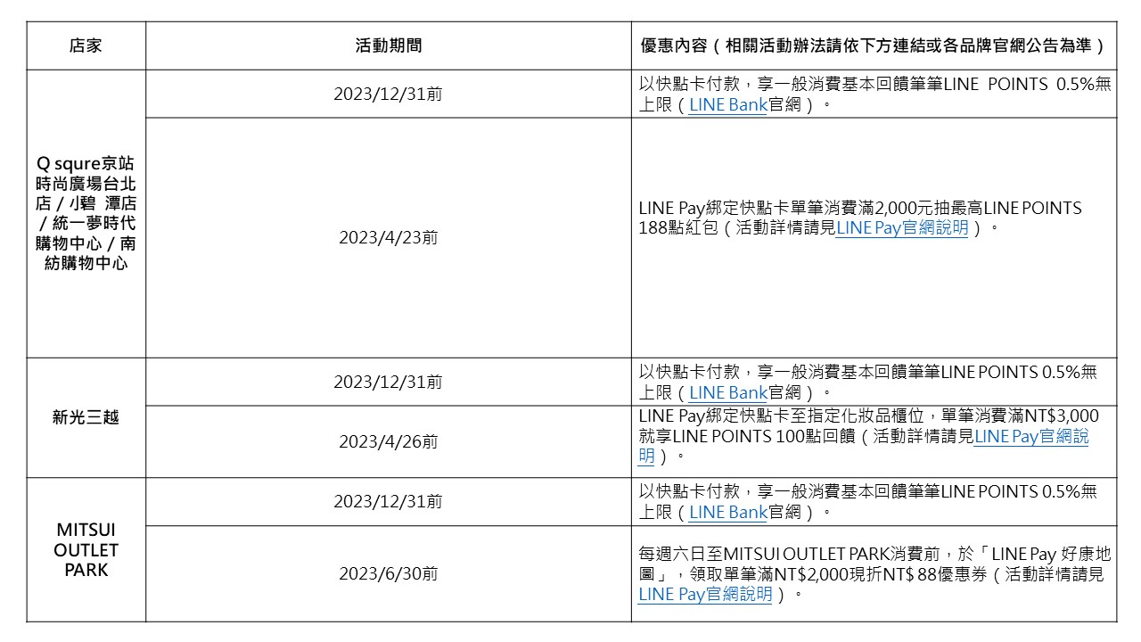 疫情趨緩,想利用購物來放鬆悶了好久的心理壓力?大肆採買前,不如在2023/4/23前,至Q squre京站時尚廣場/統一夢時代購物中心/南紡購物中心以LINE Pay綁定快點卡付款,即享「天天LINE Pay日」活動優惠,單筆消費滿NT$2,000抽最高LINE POINTS 188點紅包,等於獲得近9折優惠。